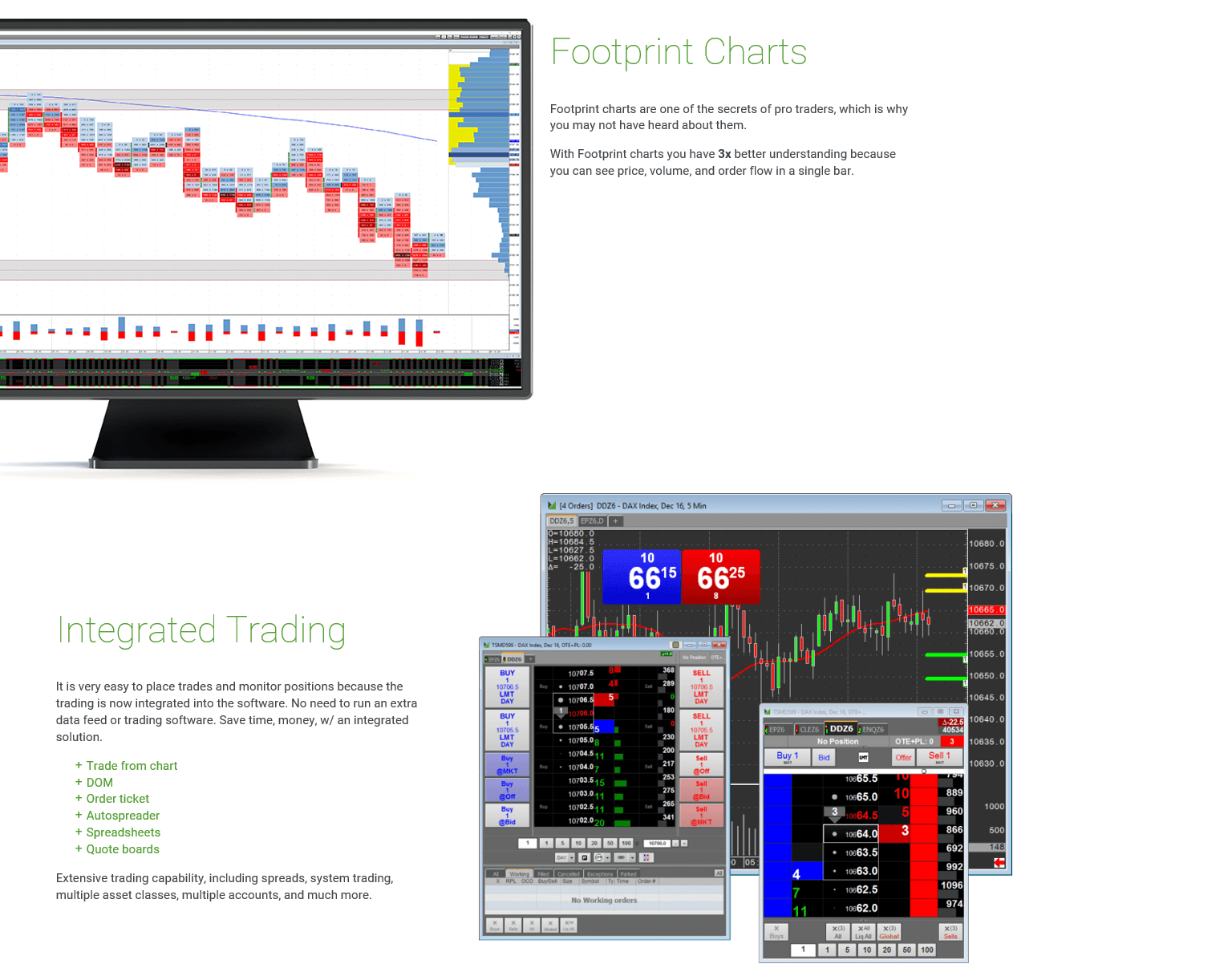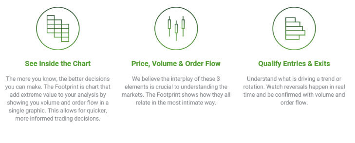 Tracks volume with price to produce a multi-dimensional display Gain Confidence – Follow and better understand order flow to the bid and ask Each Footprint combines price and volume to act as a thermometer of price strength and then alerting through color Filters The Noise – See Inside the price bar for clues to whether price is strengthening or weakening