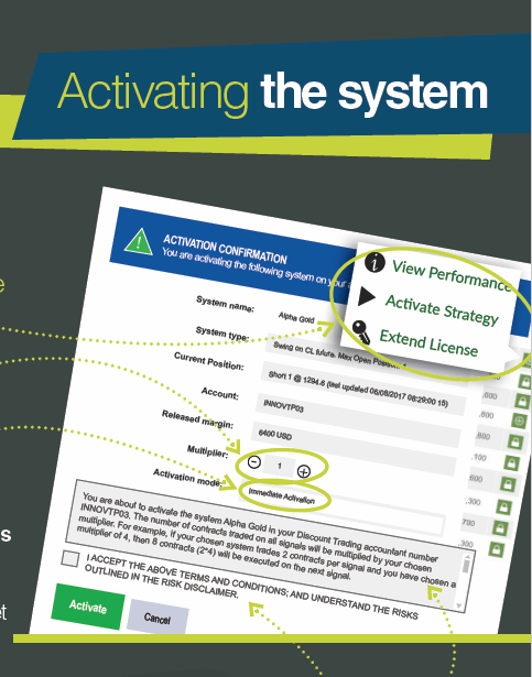 Once an account is open and a subscription is in place, the system can be activated. Clients license the rights to system signals paying a monthly ‘license fee’. You can select how many units of the system you want to trade, typically, 1 unit = 1 contract / per signal. The cost of the system is deducted from your account at the beginning of each month, and is prorated during the first month activated. You can choose different activation options depending on whether the system is currently in a trade and where the market is in relation to its latest entry price. All activations on the portal require a ‘double check’ before proceeding. You have complete 24/7 control, with ability to start, stop or change systems at any time. Computers with access to the trading signals make sure your trades get executed automatically.
