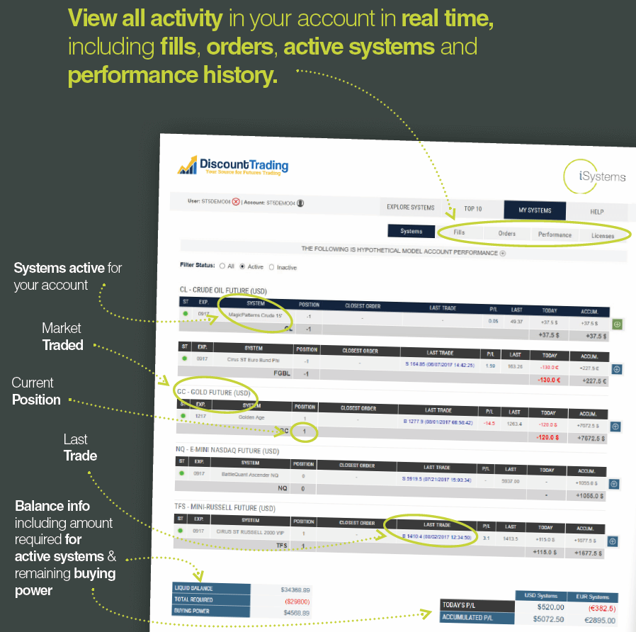 View all activity in your account in real time, including fills, orders, active systems and performance history. With the easy to use client portal, you can turn on or off a trading system whenever you want. Want to take a profit on a particular trade? You can do that from the client portal. Want to stop a particular trading system when the current trade is closed? You can also do that from the client portal. Want to trade a different system than the one you are currently using? You will be able to see updated results of all the trading platforms, and have the ability to add or switch systems whenever you like.